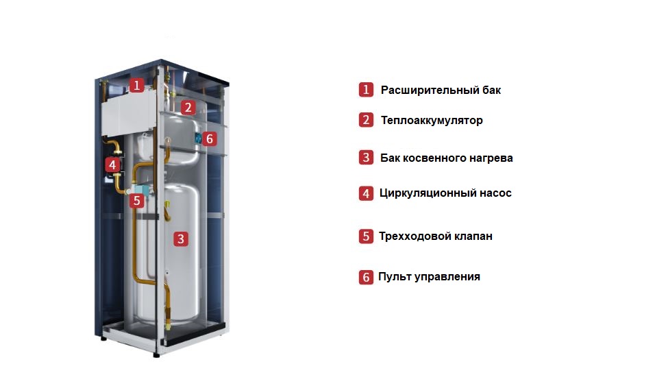 - Два типа накопительных емкостей: буферный бак для стабилизации работы режимов отопления и охлаждения, а также специализированный бак для подготовки бытовой горячей воды (ГВС).